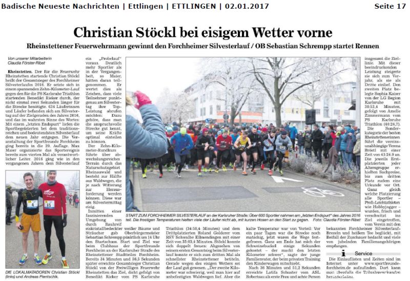 Mit Zeiten von 34 bis 52 Minuten erreichten vier Läufer der Freiwilligen Feuerwehr Rheinstetten das Ziel des diesjährigen Forchheimer Silvesterlaufs deutlich unter einer Stunde. Den Grad ihrer Fitness beim 10 km Rundlauf bestätigten bei Minustemperaturen: Christian Stöckl (Gesamtsieger), Simon Oehler, Klaus Kornmüller und Philip Bennewirtz gemeinsam mit weiteren knapp 650 Läuferinnen und Läufern.